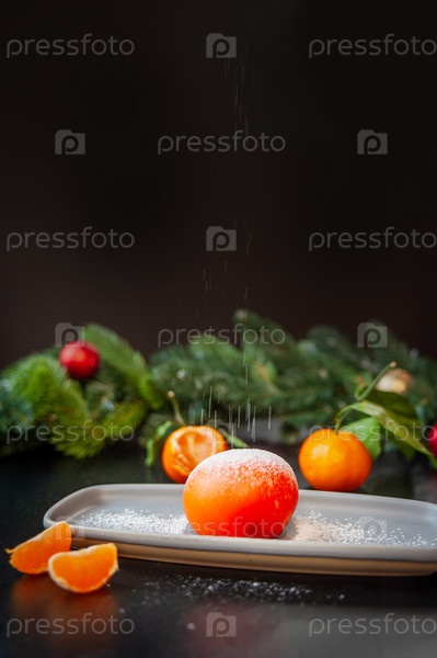 Тарелка с вкусным моти и мандарином на темном рождественском фоне