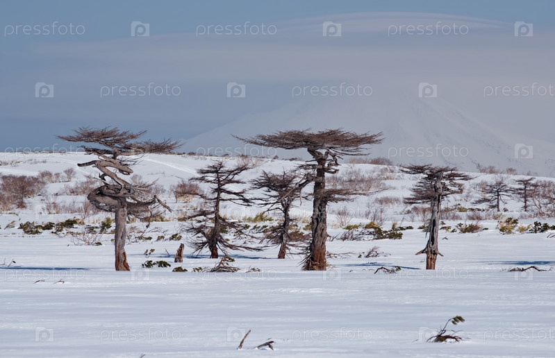 Россия, Дальний Восток, Курильские острова. Причудливые лиственницы и корявые каменные березы в окружении бамбука на фоне заснеженных вершин вулканов