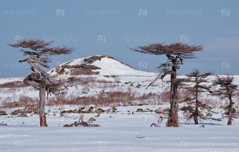Россия, Дальний Восток, Курильские острова. Причудливые лиственницы и корявые каменные березы в окружении бамбука на фоне заснеженных вершин вулканов