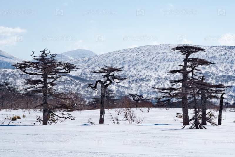 Россия, Дальний Восток, Курильские острова. Причудливые лиственницы и корявые каменные березы в окружении бамбука на фоне заснеженных вершин вулканов