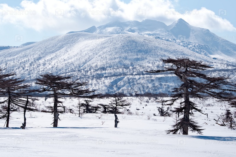 Россия, Дальний Восток, Курильские острова. Причудливые лиственницы и корявые каменные березы в окружении бамбука на фоне заснеженных вершин вулканов
