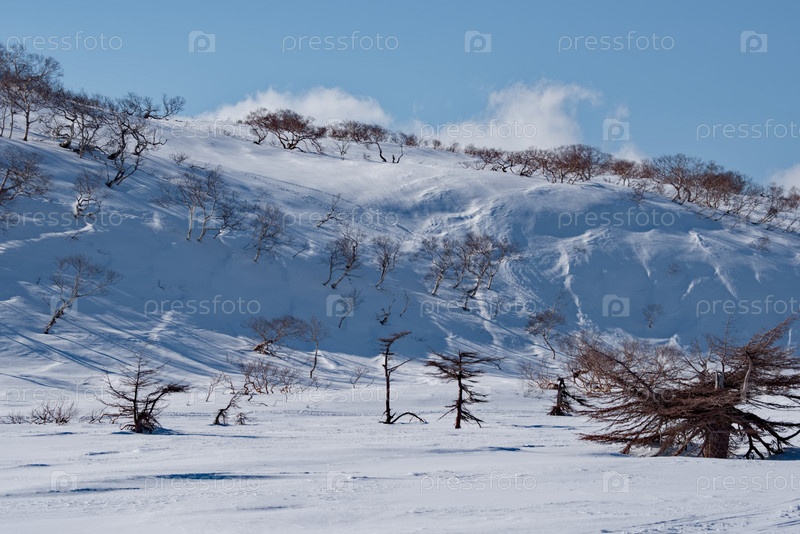 Россия, Дальний Восток, Курильские острова. Причудливые лиственницы и корявые каменные березы в окружении бамбука на фоне заснеженных вершин вулканов