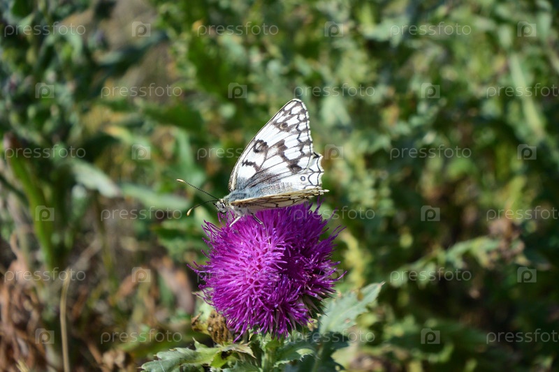 Бабочка собирает пыльцу с цветка лопуха
