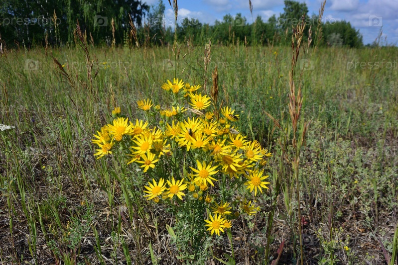 Желтые полевые цветы на фоне лесного поля и голубого неба