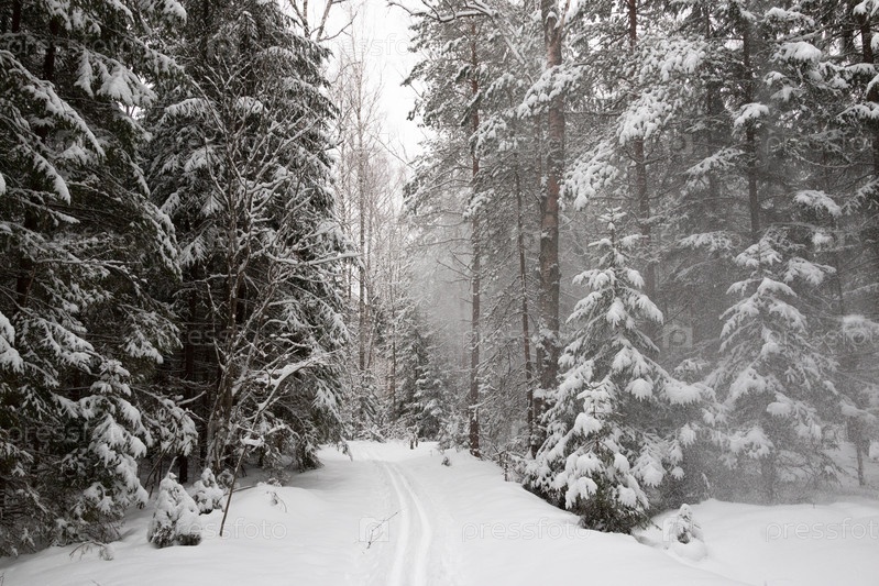Метель, заснеженные елки, лыжня и сугробы в зимнем лесу