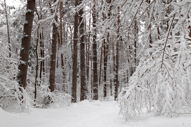 Сосны, лыжня, сугробы и заснеженные деревья в зимнем бору