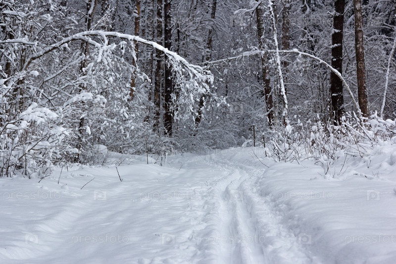 Лыжня, сугробы и изогнутые под тяжестью снега деревья в зимнем лесу