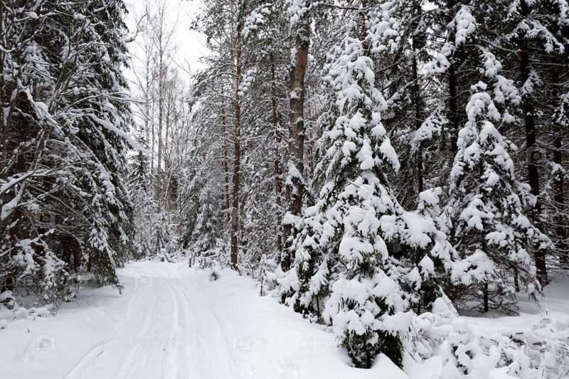 Заснеженные елки, лыжня и сугробы в зимнем лесу