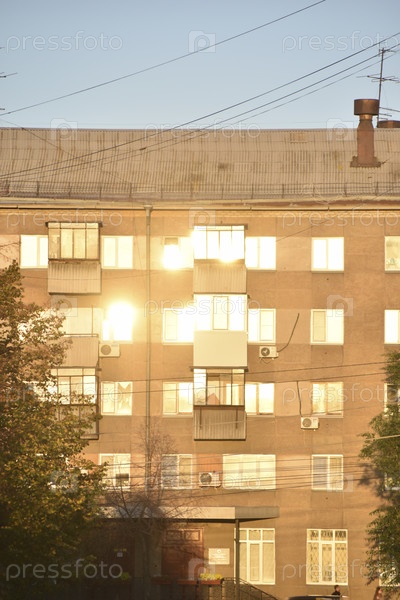 Здание в городе залито солнечным светом и летняя улица с машинами. Окна на солнце