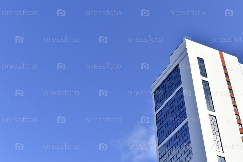 Новые жилые и офисные здания. Красивый фасад желто-красного здания. Окна и балконы
