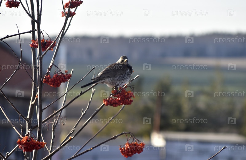 Перелетная птица питается рябиной. Серая птичка ест ягоды