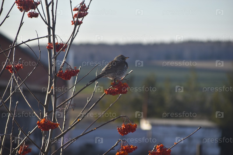 Перелетная птица питается рябиной. Серая птичка ест ягоды