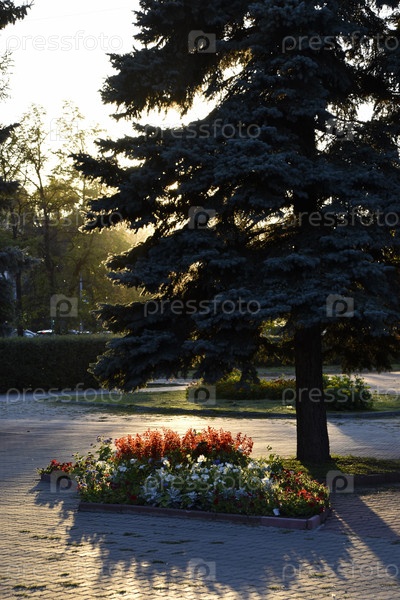Дерево, залитое солнцем в осеннем саду вечером. Красивый закат в парке города