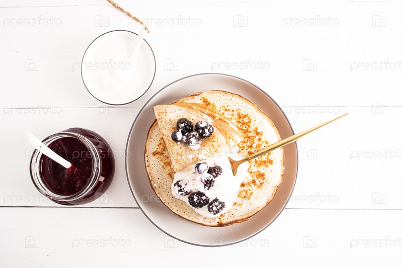 Вид сверху на большую керамическую тарелку с блинами со сметаной и свежими ягодами. баночка малинового варенья, миска сметаны. натюрморт