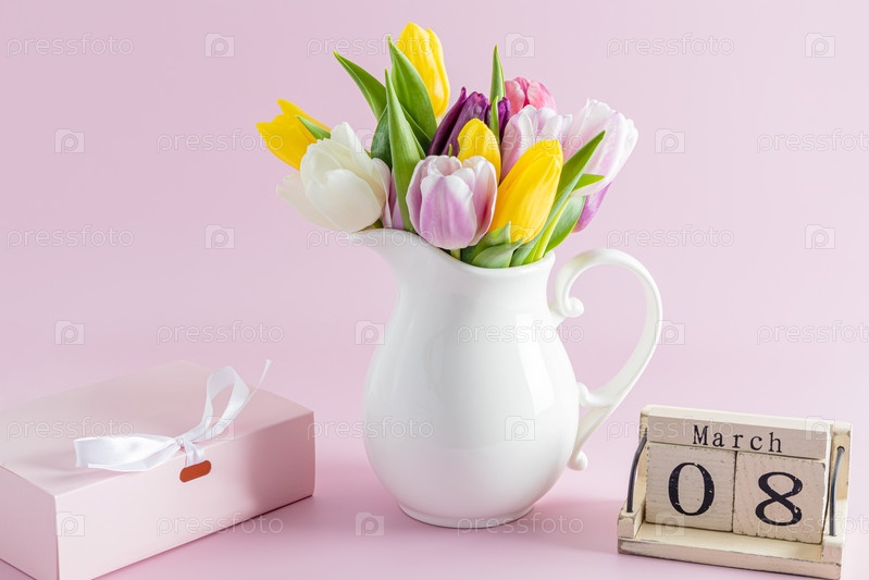 Праздничная композиция из разноцветных тюльпанов в белом кувшине, праздничной коробке и деревянном календаре с датой весеннего женского праздника