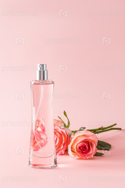 Шикарный высокий флакон женских духов на пастельном фоне с тремя чайными розами. Вертикальный вид. Презентация нежного аромата духов