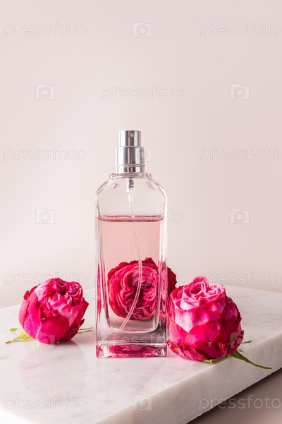 Элегантный флакон женских духов или туалетной воды стоит на белом мраморном подиуме среди прочитанных бутонов роз. Вертикальный вид. Копировальное пространство. пастель