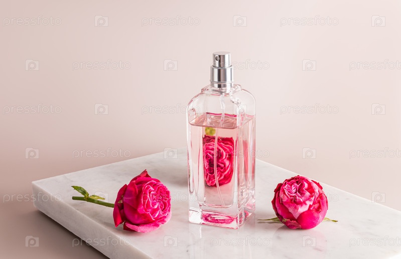 Шикарный флакон женских духов с нежным ароматом розы стоит на белом мраморном подиуме. передний план. читать розы. Презентация аромата