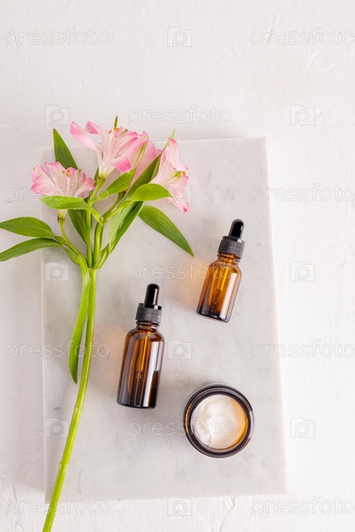 На мраморном подиуме лежат сыворотка в двух косметических флаконах с капельницей и открытая банка с увлажняющим кремом для ухода за кожей лица и тела. Вид сверху. Цветы