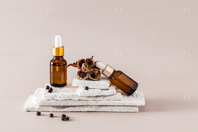 Две косметические бутылочки с капельницей с натуральным увлажняющим кремом, сывороткой с пептидами для ухода за кожей лица на кусочках белого кирпича. Пустая упаковка