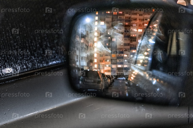 Отражение ночного города в зеркале заднего вида, размытый фон, боке