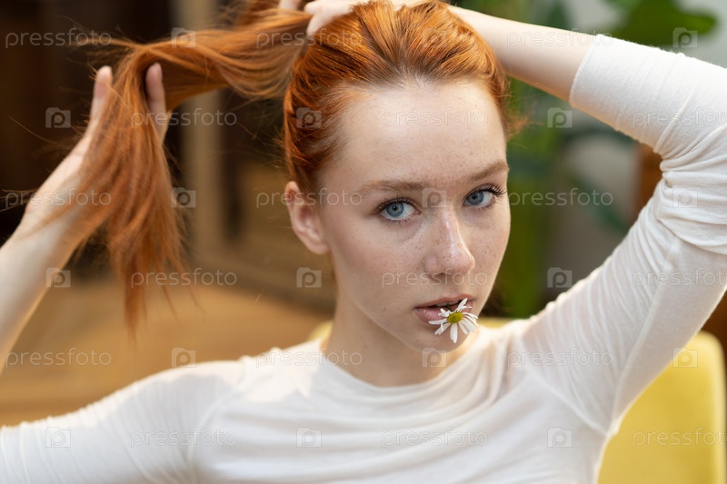 Портрет молодой красивой женщины с рыжими волосами в студии