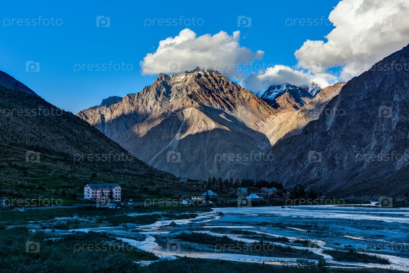 Деревня Джиспа в Гималаях на закате. Долина Лахаул, Химачал-Прадеш, Индия