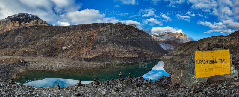 Панорама горного озера Сурадж Тал в Гималаях на дороге Манали-Лех на рассвете. Долина Лахаул, Химачал-Прадеш, Индия