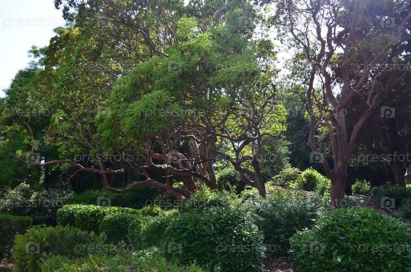 Арбутус-унедо в Ливадийском парке Крыма вечнозеленые деревья с красноватым стволом, лишенным коры