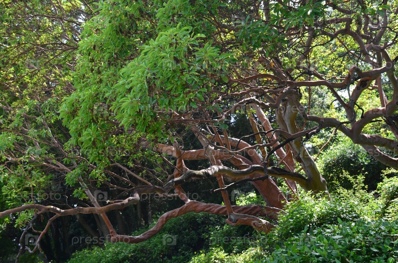 Арбутус-унедо в Ливадийском парке Крыма вечнозеленые деревья с красноватым стволом, лишенным коры