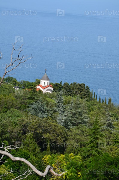 Церковь Покрова Пресвятой Богородицы в Нижней Ореанде в окружении густых зарослей деревьев на берегу Ялтинского залива Черного моря в Крыму
