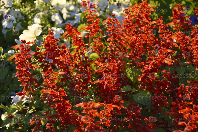 Красные цветы шалфея и петунии на клумбе вечером в городе. Красивая клумба в городе