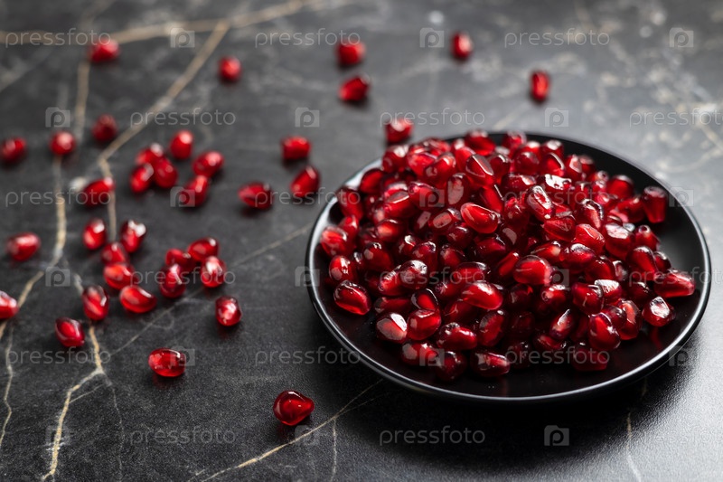 Зерна граната в черной тарелке на столе