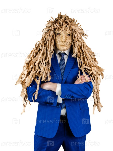 Офисный работник в синем деловом костюме надел маску шута-гоблина