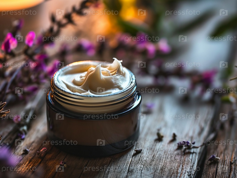 Крем для лица на деревянном столе рядом с сиреневыми цветами