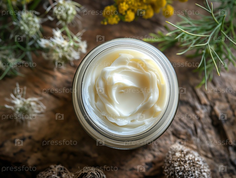 Крем для ухода за лицом на коре дерева рядом с цветами, вид сверху