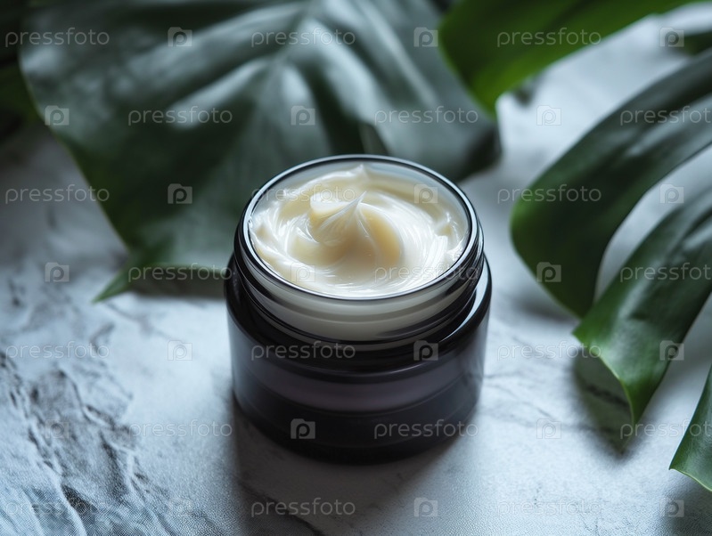 Баночка с кремом для ухода на столе, на заднем плане зеленые листья