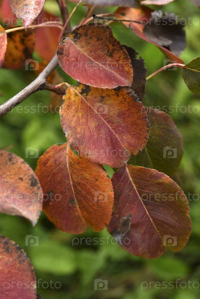 Красочные осенние листья яблони в саду. Красивые красные и желтые листья. Цвета осени