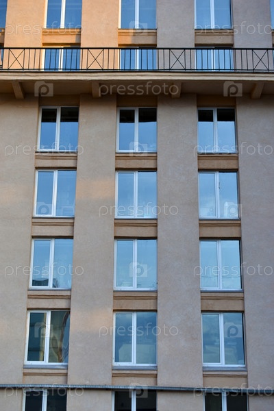 Фасад классического здания в городе. Окна здания выполнены в старинном стиле. Красивые окна и желтые стены дома