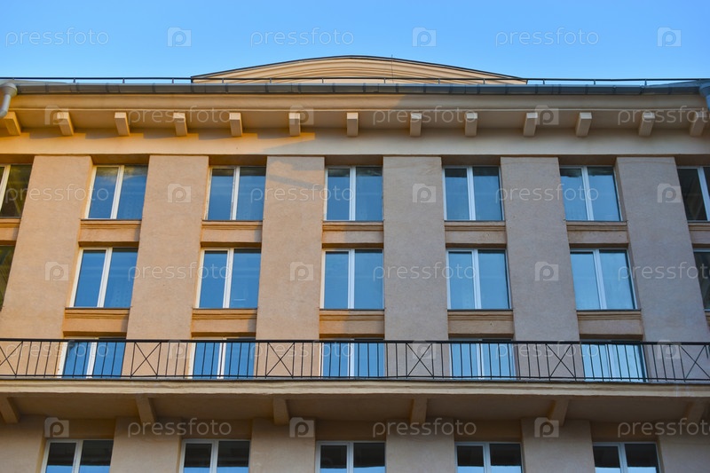 Фасад классического здания в городе. Окна здания выполнены в старинном стиле. Красивые окна и желтые стены дома