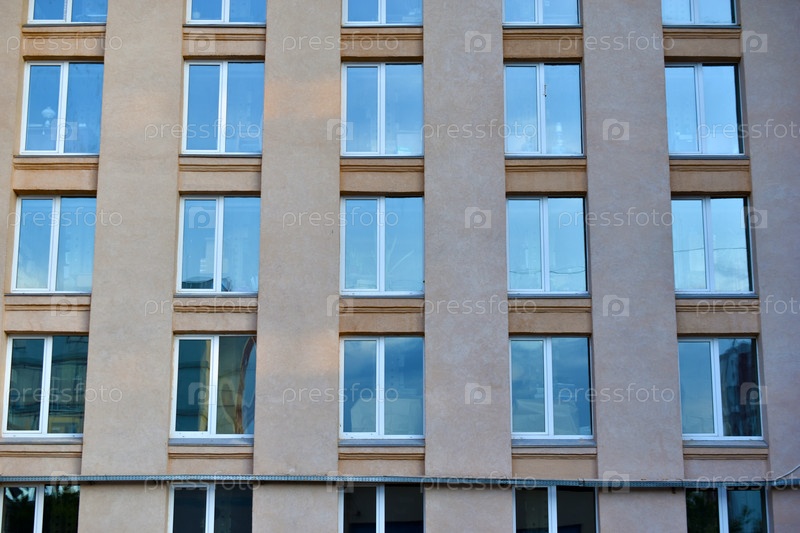 Фасад классического здания в городе. Окна здания выполнены в старинном стиле. Красивые окна и желтые стены дома