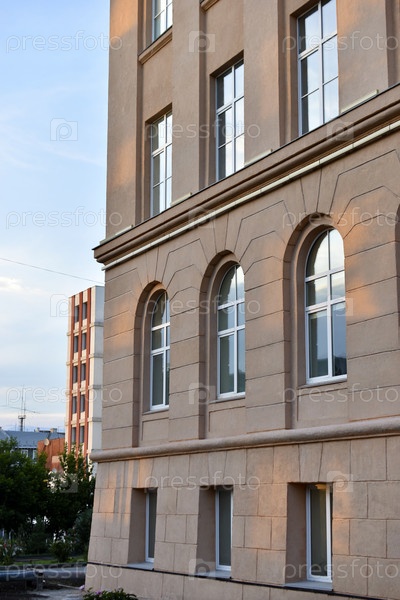Фасад классического здания в городе. Окна здания выполнены в старинном стиле. Красивые окна и желтые стены дома
