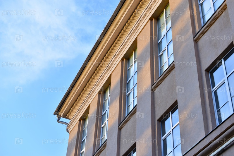 Фасад классического здания в городе. Окна здания выполнены в старинном стиле. Красивые окна и желтые стены дома