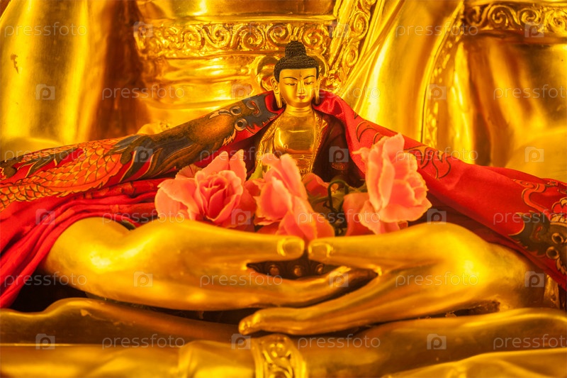 Маленькая статуя Будды Шакьямуни в руках больших