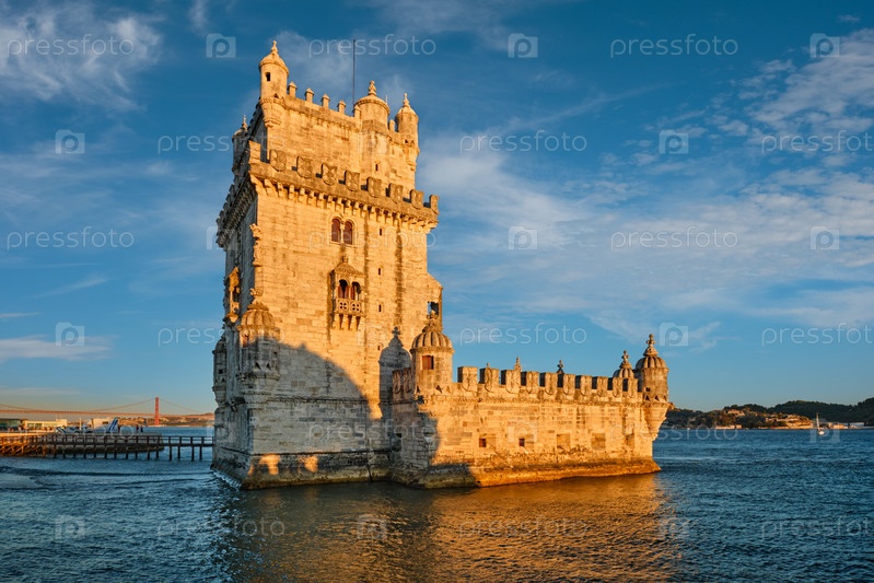 Башня Белен или Башня Святого Винсента - известная туристическая достопримечательность Лиссабона и туристическая достопримечательность - на берегу реки Тежу Тежу на закате. Лиссабон, Португалия