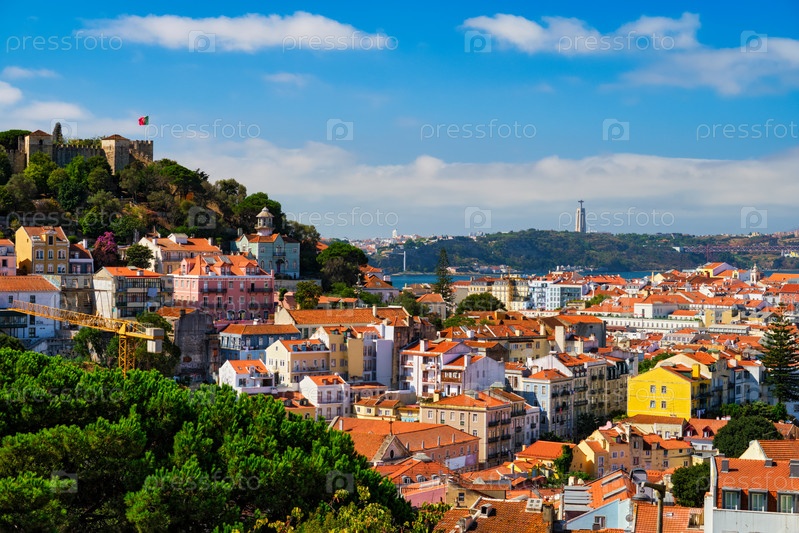 Знаменитый вид Лиссабона с туристической смотровой площадки Мирадору-дус-Баррос на старый район города Алфама с замком Святого Георгия и флагом Португалии, мост 25 апреля, статую Христа-короля. Лиссабон, Португалия