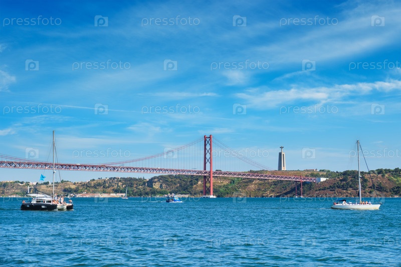 Вид на мост 25 апреля через реку Тежу, памятник Христу Царю и яхту. Лиссабон, Португалия