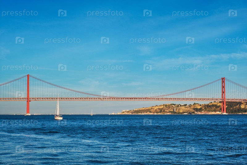 Вид на мост 25 апреля через реку Тежу, памятник Христу Царю и яхту на закате. Лиссабон, Португалия