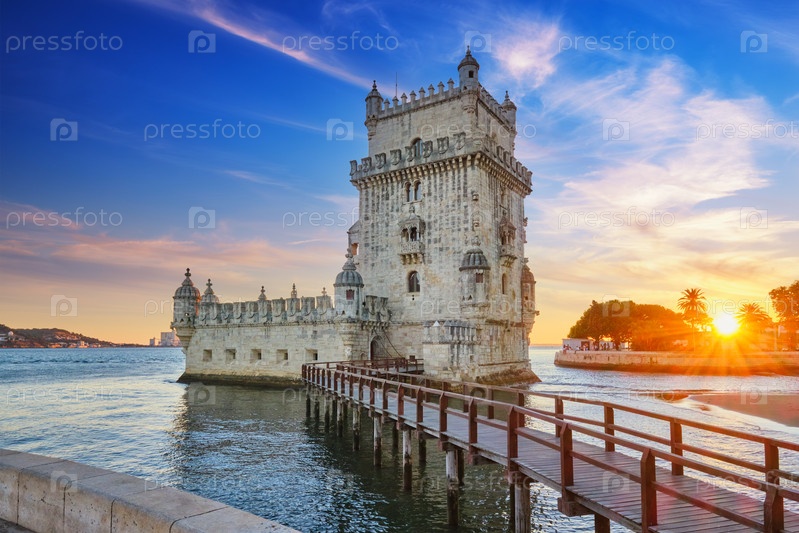 Башня Белем на берегу реки Тежу на закате. Лиссабон, Португалия