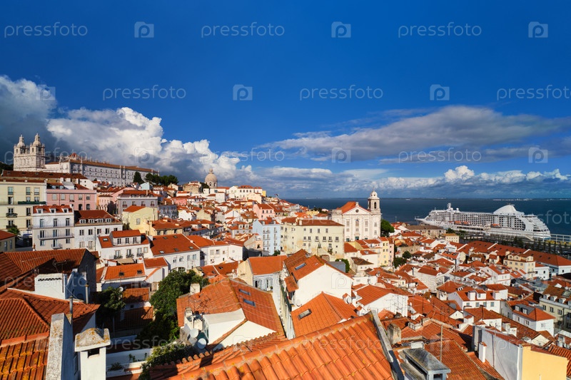 Вид на Лиссабон со смотровой площадки Мирадуро-де-Санта-Лузия с пришвартованным круизным лайнером и движущимися облаками. Лиссабон, Португалия